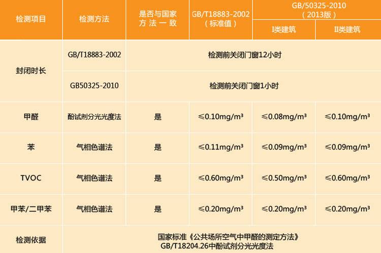 目前,我国执行《民用建筑室内环境污染控制规范》GB50325-2010与《室内空气质量标准》GB/T18883-2002标准,对因新建、装修民用建筑室内空间进行空气质量测定。
