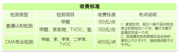 说明: 客户预约检测时请提前告知检测类型,不同检测类型采样试剂配比不同,收费标准也有差异;如果仅是想了解室内空气污染程度,选择普通认知检测即可,如果涉及民事纠纷或者要更精准全面了解室内空气质量则选择CMA专业检测。