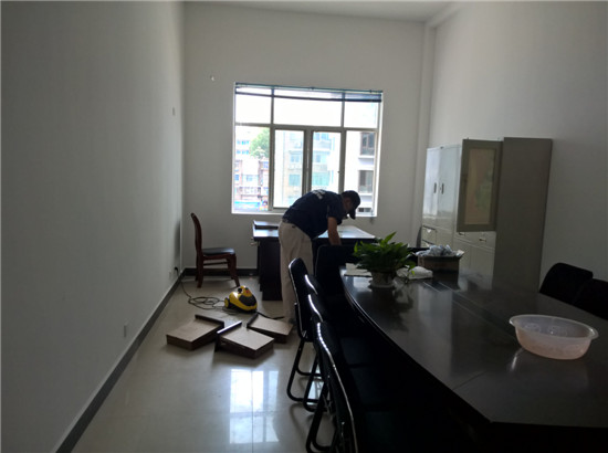 该办公室家具为仿红木深色家具,材质为密度板混合油漆杂料,具有油漆味、刺鼻异味,经我公司系统治理后,刺激异味大幅降低,已经达到办公入住条件。