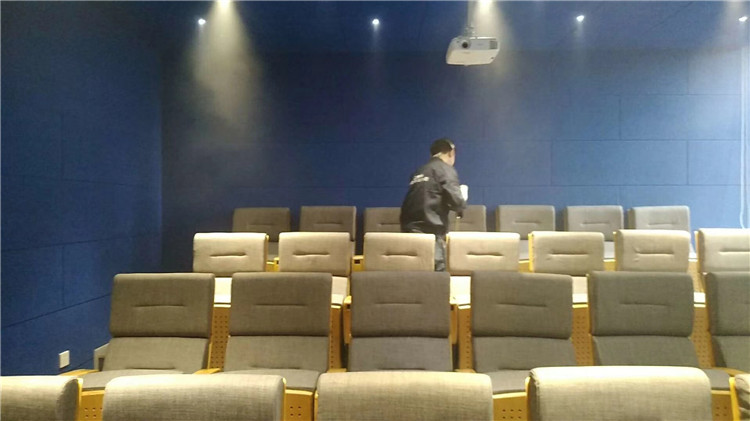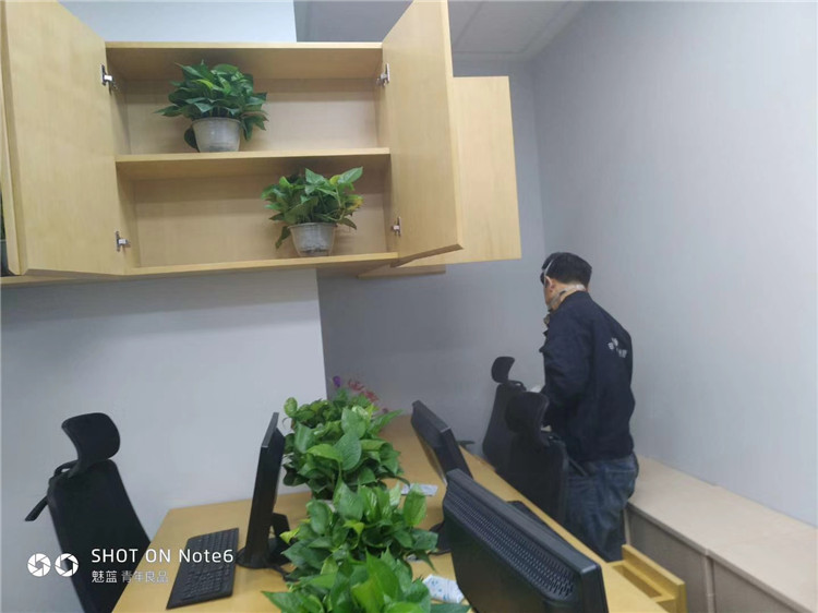 工程概况:三聚氰胺贴皮颗粒板办公工位、文件柜、乳胶漆墙面、网伦回弹海绵座椅、吸音棉墙面
