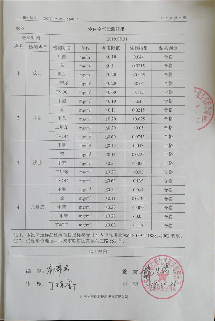CMA检测结果,甲醛、苯、甲苯、二甲苯、TVOC均符合要求