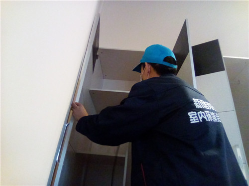 工程概况:治理前检测显示房间内氨气超标3倍,房间异味明显,公司技术人员判断主要污染源为密度板为主材的高箱床及人造板式衣柜;