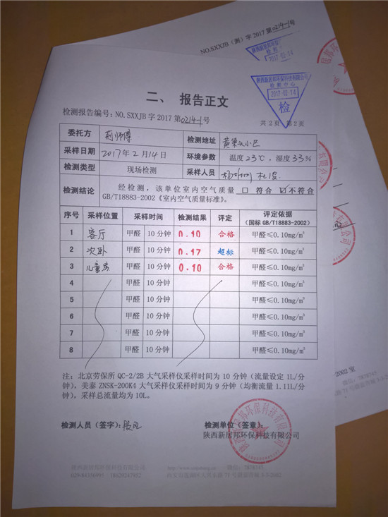 从今天的三个点位的采样分析结果来看,荆先生新居次卧甲醛明显超标,客厅与客卧则刚好处于国标线少,因此,次卧目前的室内环境并不适合孕妇或准备要小孩的夫妇居住。新房做一次甲醛检测是很有必要的。