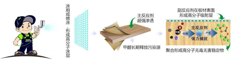 高分子除醛净味剂快速渗透板材强力捕捉甲醛分子与之交联从而达到清除残留甲醛的目的