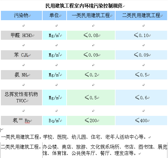 ———限量值不同,“规范”将限量值划分为以住宅为主的Ⅰ类建筑和以办公楼为主的Ⅱ类建筑,分别予以规定;“标准”则不进行划分,采用统一的标准。“标准”中的限量值除氨外,其它值基本为“规范”的Ⅱ类建筑限量或介于两类之间,而苯的限量值更大。