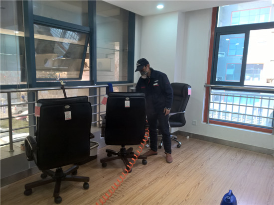技术人员在对板材家具进行异味清除处理