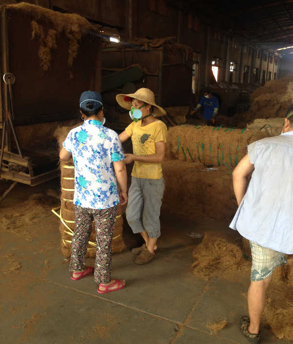 厂家生产棕垫时的情景(异味刺鼻,工人佩戴防毒口罩)