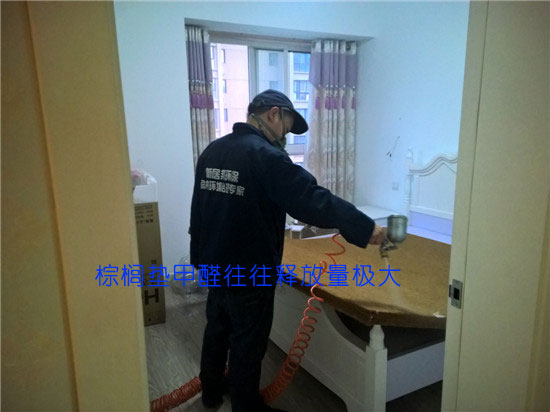 床垫甲醛含量较多的主要存在与棕榈垫中,处理时将棕榈垫芯取出仔细喷涂立美净除醛净味双效触媒,要求喷湿喷透,可彻底清除游离甲醛,消除床垫的酸味、刺激异味。