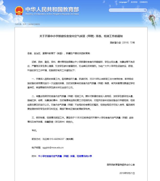 教育部于2018年曾专门发文,要求严格监管新建校舍的室内空气质量问题,做好持续跟踪监测,不达标的校舍不准投入使用,整合一切社会资源,对产生甲醛超标、室内空气污染的校舍进行有效整改。该文件重点提到西安发生的新建校舍甲醛超标问题,