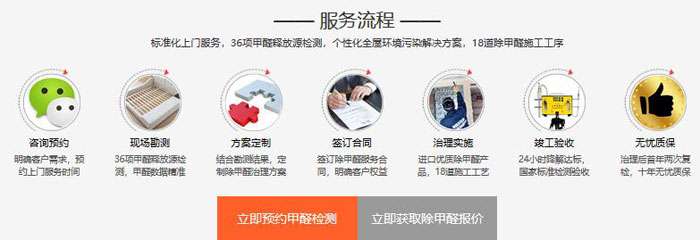 正因为解决装修污染类似医生看病,需要用到检查问诊手段,因此,正规的室内除甲醛公司会有一系列的规范服务流程,最简单的步骤必须包含:1、施工前的甲醛检测,判定甲醛超标程度;2、甲醛超标程度,制定解决方案;3、规范化施工;4、再次标准化检测验收;5、持续跟踪空气质量。这些流程在公司的企业网站或者宣传材料中有明确公示,消费者可查阅比选,如果服务流程都没有规范化的公司,也是可以PASS掉的。