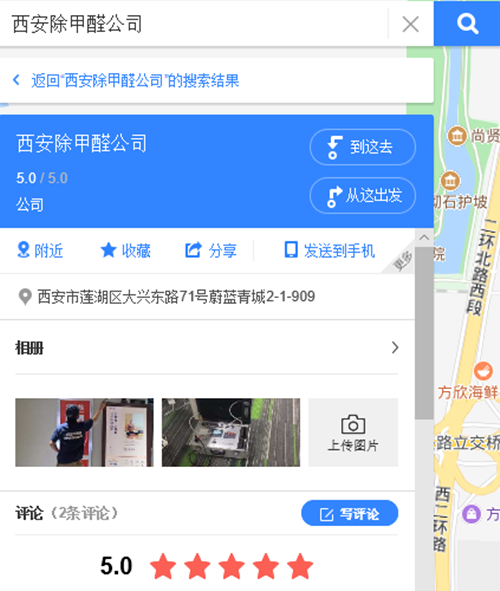 地址:西安市莲湖区大兴东路71号蔚蓝青城2号楼1单元909室,电话4001280558,也可以直接在百度地图搜索西安除甲醛公司,百度地图上显示的第一家就是。