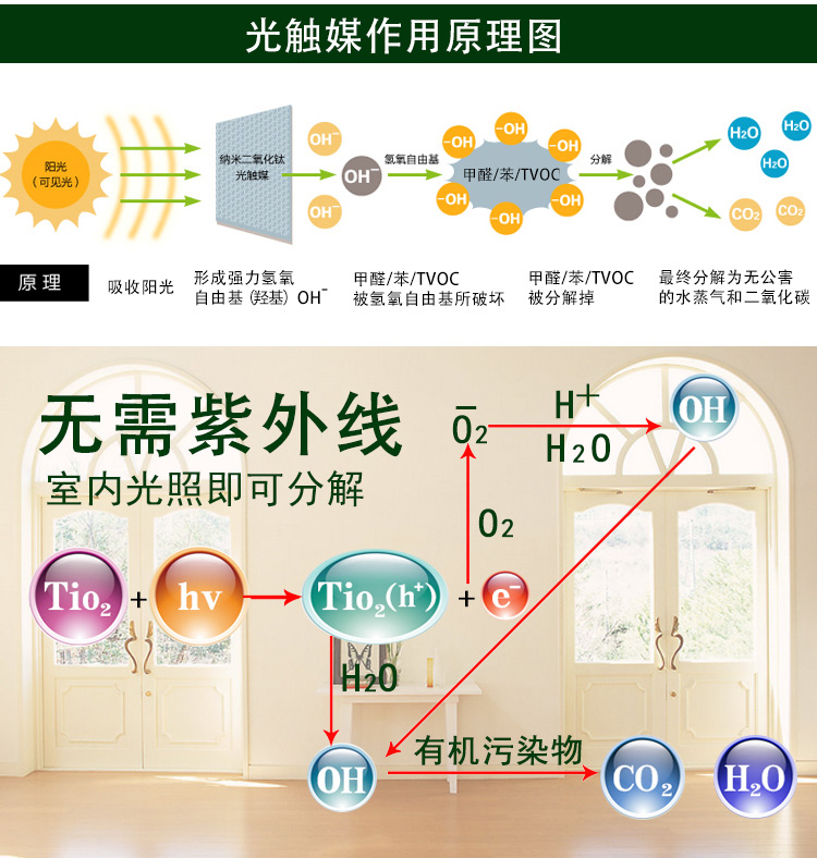 立美净全屋净化解决方案包含成套组合技术,包含清除游离甲醛和室内异味的广谱除味技术,针对板材甲醛主要释放源进行源头治理的除醛净味双触媒技术以及立美净光触媒技术。以光触媒为例,立美净光触媒可以在室内自然光或日光灯下产生催化反应(即氧化还原反应),产生具有强氧化力的氢氧游离基,能大幅度、持续不断的分解甲醛、苯、TVOC、氨等有害气体,在去除有害气体的同时,还可以杀菌、去臭、抗菌、防霉、防污、净化空气的效果。使室内空气更加清新、健康,立美净光触媒具有持久性,理论效用可以持续5-8年。