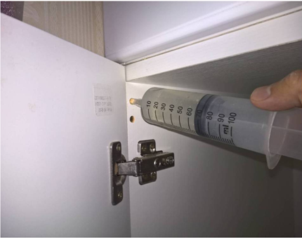 采用针筒式注射器将立美净除醛净味双效触媒注入钉眼以渗透捕捉游离甲醛