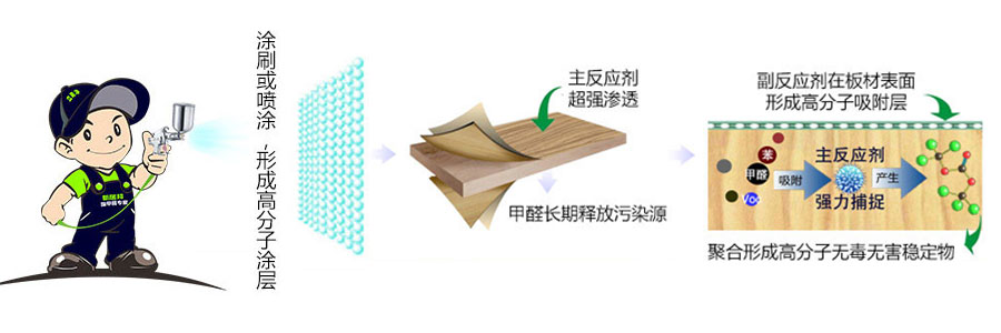 本产品由植物提前高分子聚胺系物、甲克素、除醛因子等组合而成,具有高渗透性,喷涂于人造板家具板面,其主反应剂超强渗透板材内部,主动吸附捕捉游离态甲醛分子,副反应剂在家具表面强力吸附,这种吸附作用属于气体分子由固态→液态体系的扩散,扩散速度很快,是甲醛等异味分子自然释放(固态→气态体系的分子运动)的数千倍,因此,往往需要自然释放数月至一年以上的有害物质分子释放周期可以缩短在几十小时内完成,并且整个过程由于产品中的有效官能团能将甲醛等有机物分子捕捉并分子交联聚合,形成稳定无毒无害的高分子稳定物,因此除醛去味过程是不可逆的,从而达到净化室内空气的效果,而其纯天然的特性又不会造成二次污染。